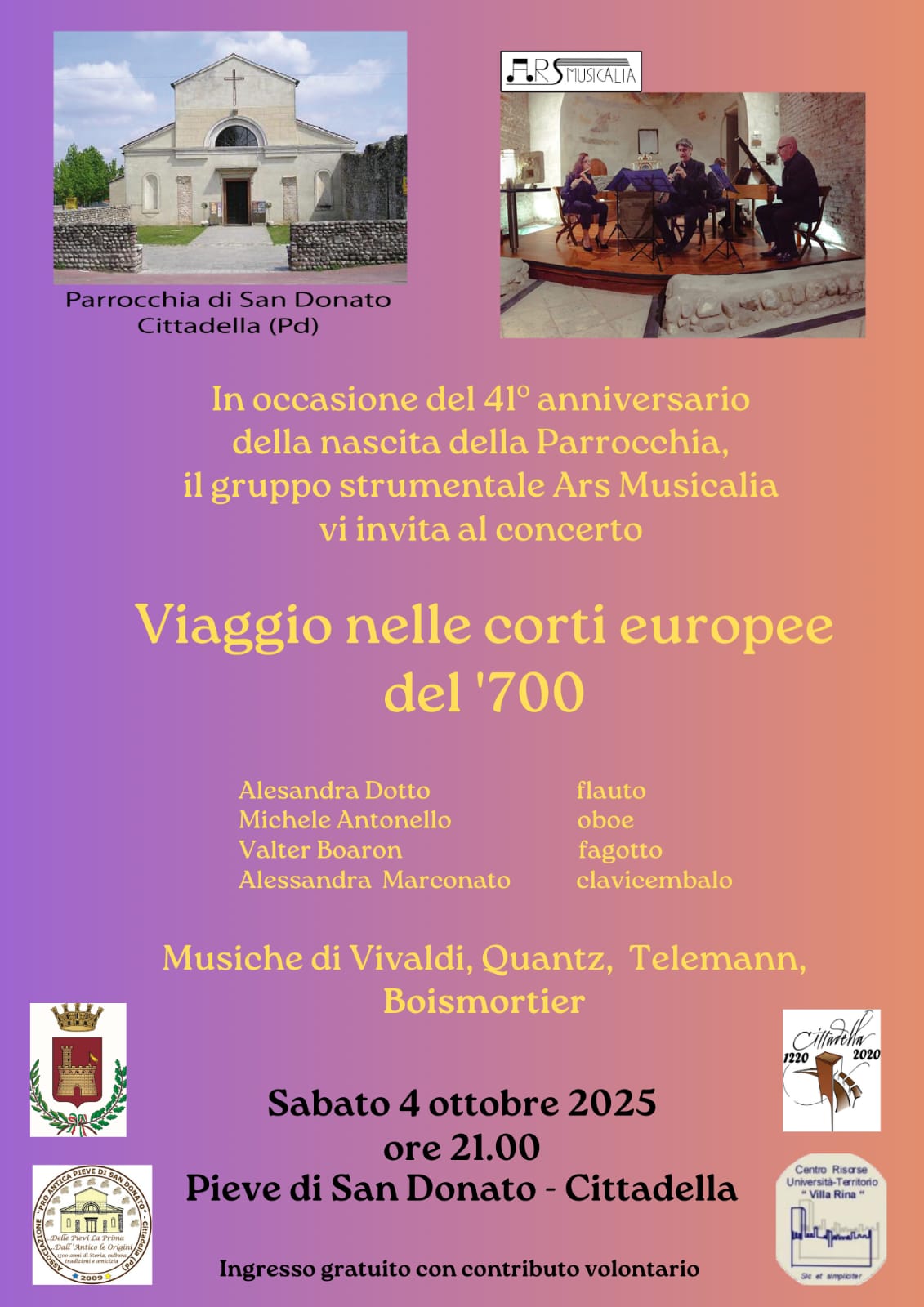 In occasione del 41° anniversario della nascita della Parrocchia di San Donato, il gruppo strumentale Ars Musicalia propone un concerto con musiche d'intrattenimento di alcuni dei grandi compositori del periodo barocco che hanno contributo al prestigio delle corti europee del loro tempo. Gruppo strumentale Ars Musicalia "Viaggio nelle corti europee del '700”   Alessandra Dotto - flauto traverso Michele Antonello - oboe Valter Boaron - fagotto Alessandra Marconato - clavicembalo   Musiche di Vivaldi, Quantz, Telemann, Boismortier Sabato 4 ottobre 2025 Pieve di San Donato – Cittadella ore 21.00